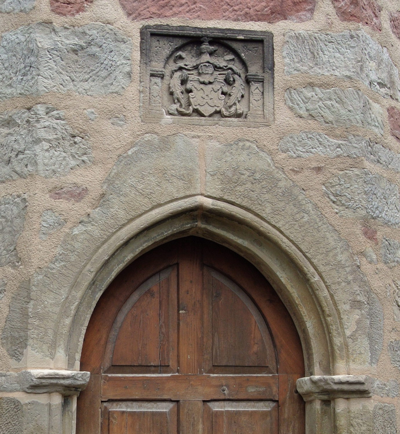 The door has a seal above it with the year 1587 carved into it. The church was burned "to the masonry" twice, once in 1634 and once in 2012. It is currently undergoing reconstruction, but they're also performing an archeological dig in the process, as they find burials everywhere, some not even a foot underground.