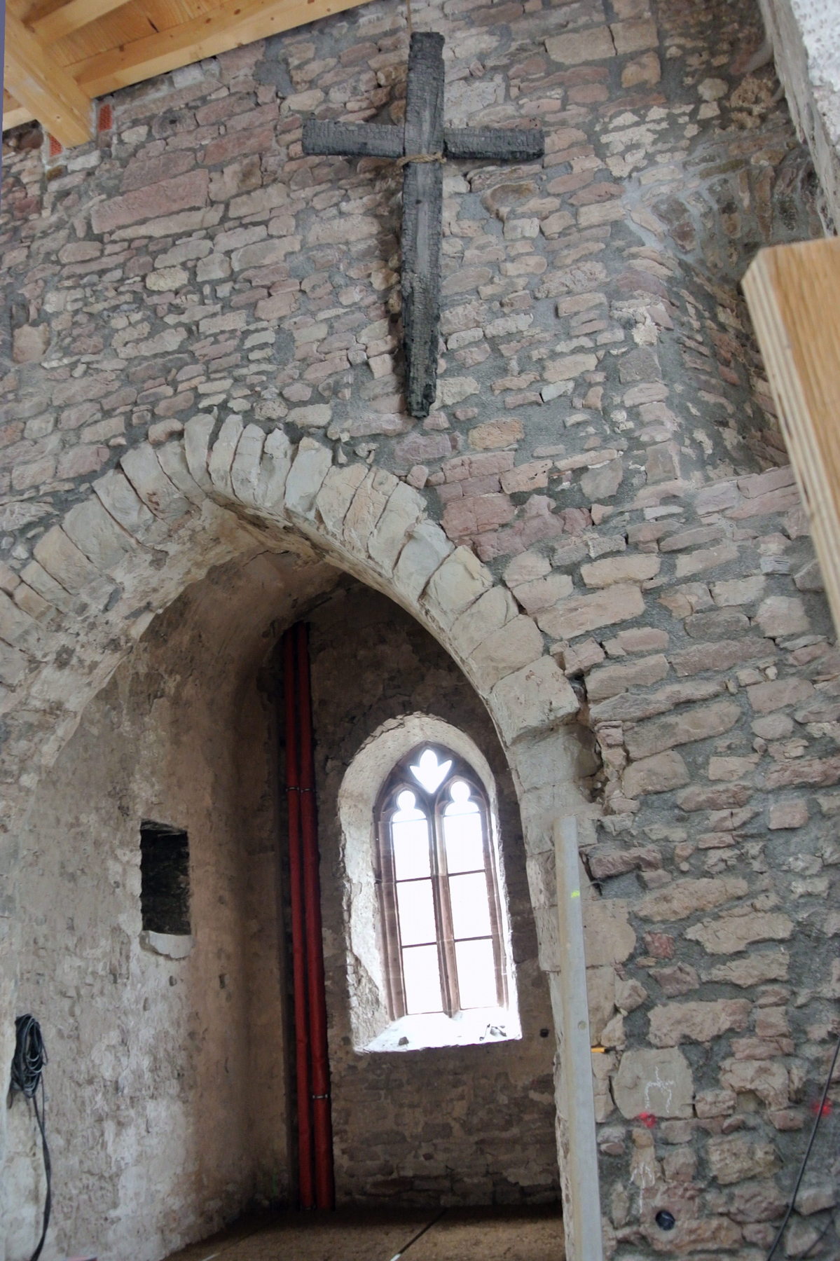 Looking inside the church, you can see it's been completely gutted. They're putting in a heated floor, and some charred boards form a crude cross near the entrance. Our ancestors would have sat in this church in the 1600's and probably many years before that. They quite likely helped fund the original building of this church.