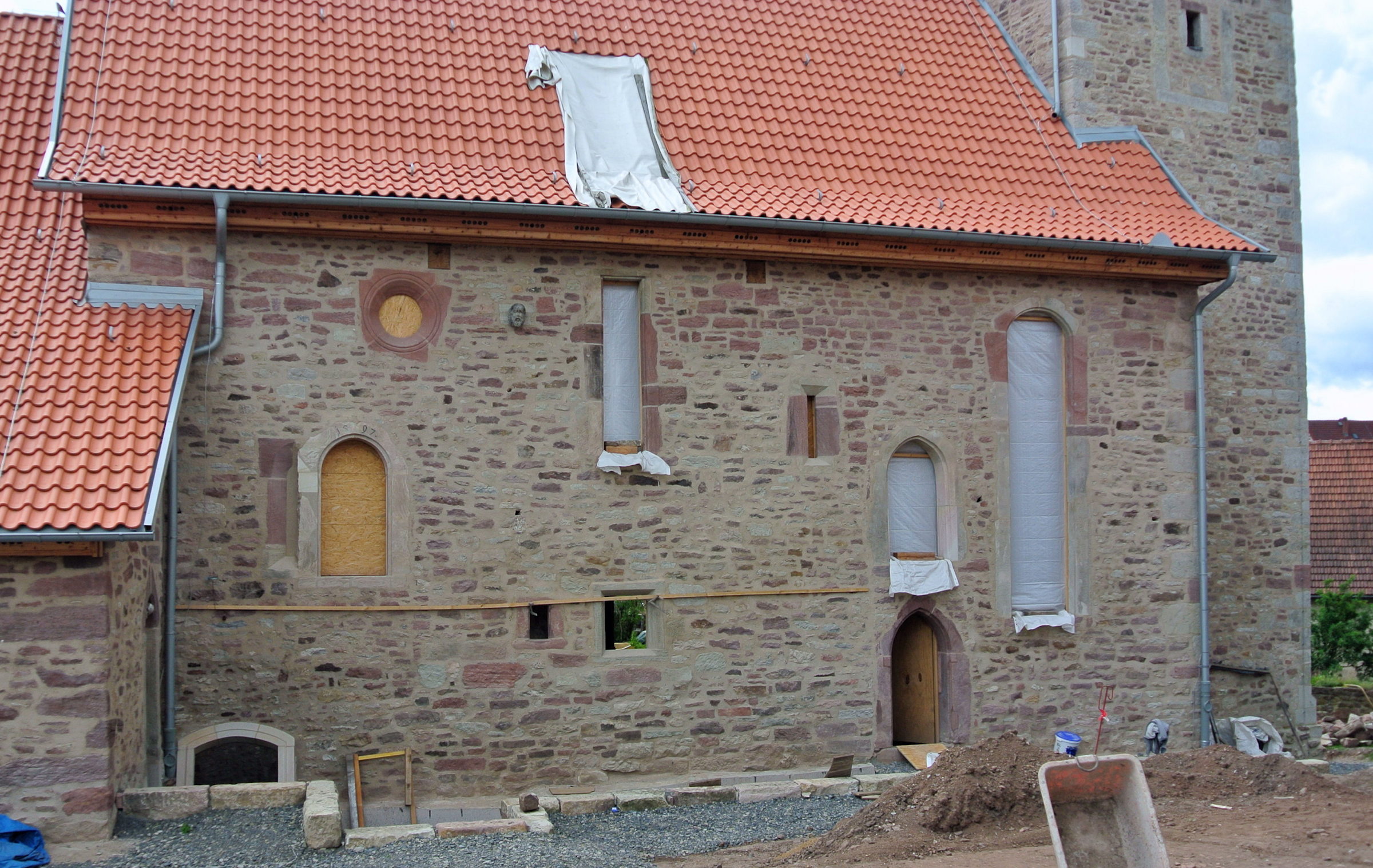 The door has a seal above it with the year 1587 carved into it. The church was burned "to the masonry" twice, once in 1634 and once in 2012. It is currently undergoing reconstruction, but they're also performing an archeological dig in the process, as they find burials everywhere, some not even a foot underground.